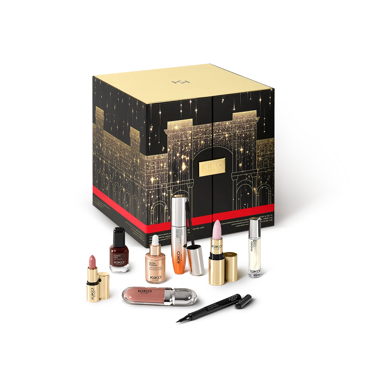 Inclui:– N.º 1 Sombra Holiday Wonderlights Metallic Magnitude Eyeshadow 01    – N.º 1 Batom líquido New Lasting Matte Veil Liquid Lip Colour 15– N.º 1 Verniz de unhas Power Pro Nail Lacquer 27– N.º 1 Lápis de olhos Unlimited Precision Automatic Eyeliner & Khol 16– N.º 1 Máscaras para contorno de olhos Nourishing Eye Patch– N.º 1 Lápis de olhos Colour Kajal 02– N.º 1 Esponja de mauqilhagem Holiday Wonderlights Precision Beauty Blender– N.º 1 Lápis de lábios Creamy Colour Comfort Lip Liner 08– N.º 1 Iluminador líquido Glow Fusion Highlighting Drops 02– N.º 1 Eyeliner em caneta Ultimate Pen Eyeliner 01– N.º 1 Brilho para os lábios 3D Hydra Lipgloss 20– N.º 1 Escova para o cabelo Holiday Wonderlights Hair Detangler– N.º 1 Bálsamo para os lábios Holiday Wonderlights Starlight Kiss Lip Balm– N.º 1 Máscara fixadora de sobrancelhas Eyebrow Designer Gel Mascara– N.º 1 Máscara para os lábios Holiday Wonderlights Brightening Kiss Lip Mask– N.º 1 Mini batom Holiday Wonderlights Mini Creamy Lipstick 02– N.º 1 Pincel para os olhos Eyes 52 Powder Shader Brush– N.º 1 Stick para contouring Holiday Wonderlights Bronze Signature Contouring Stick 01– N.º 1 Sérum para rosto Radiance Boost Serum Face Base– N.º 1 Eyeliner em caneta Holiday Wonderlights Twinkling Light Liquid Eyeliner– N.º 1 Batom Unlimited Stylo 21– N.º 1 Perfume Duomo District Mini Eau De Parfum– N.º 1 Máscara Maxi Mod Mascara– N.º 1 Batom Batom cintilante Holiday Wonderlights Starry Night 03Ideal para:Transformar a antecipação do Natal numa experiência de beleza única. O presente perfeito para estar rodeado de efeitos de luz encantadores todos os dias.